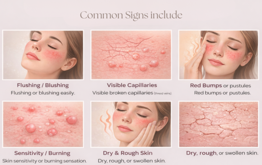 Recognising the early signs of rosacea can help in managing symptoms effectively and preventing flare-ups. Some of the most common signs include: