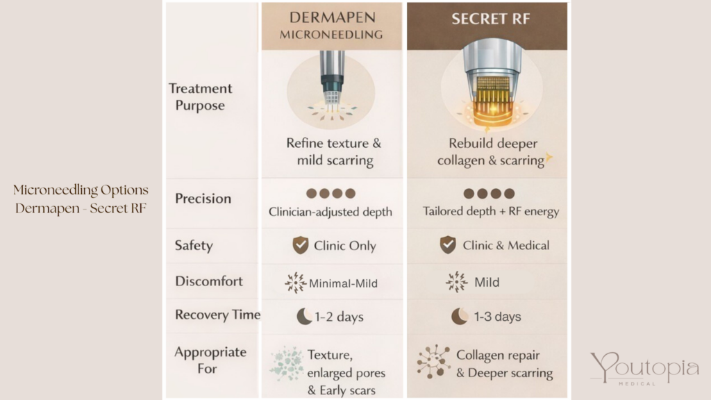 At Youtopia Medical, we offer both traditional microneedling (Dermapen) and Secret RF because they work through complementary mechanisms and can be used strategically at different stages of a skin or scarring journey.